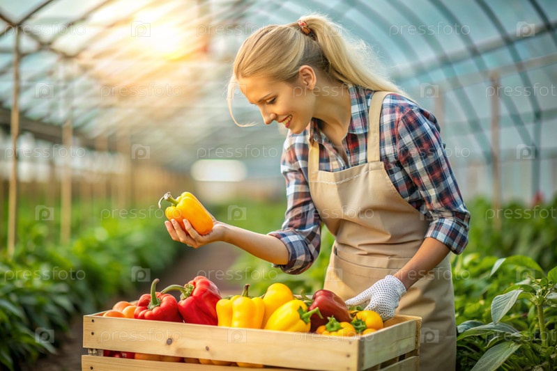 Сельскохозяйственная промышленность. деревянный ящик с перцем в руках фермерки. садовник собирает богатый урожай в теплице