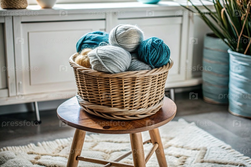 Шары из пряжи в плетеной корзине на деревянном стуле. Игла, текстиль, вязание. Зимний сезон, малый бизнес, ручная одежда
