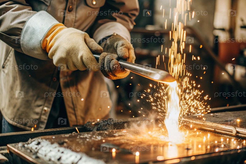 Работа на фабрике. Трудовые профессии. Мужские руки в металлических защитных перчатках. Вокруг искры. Тяжелая работа, требующая высокой концентрации и профессионализма