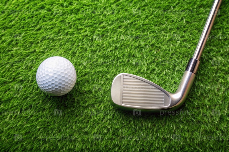 Баннер с видом на зеленую лужайку, на которой лежит белый шар и металлическая клюшка для гольфа. Реклама матча по гольфу в загородном клубе. Свободное место для текста