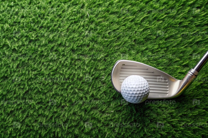 Баннер с видом на зеленую лужайку, на которой лежит белый шар и металлическая клюшка для гольфа. Реклама матча по гольфу в загородном клубе. Свободное место для текста