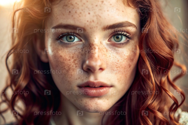 Глубокий эмоциональный портрет.Лицо молодой девушки без макияжа, с выразительными глазами, кудрявыми красными волосами и веснушками на лице. Естественная женская красота