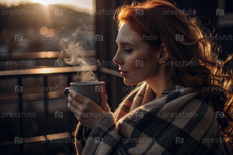 Осенняя ночь. Красивая рыжеволосая женщина, завернутая в клетку с кружкой горячего кофе на красивом террасе под лучами заходящего солнца. Девушка вдыхает аромат напитка. Романтика, комфорт и гармония