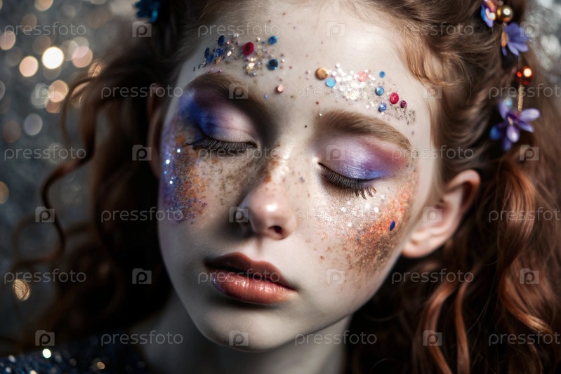 Покрытие лица девушки праздничным макияжем и ленточками.Изображение придает ей сказочный и мистический вид.Концепция новогодней ночи или дня рождения