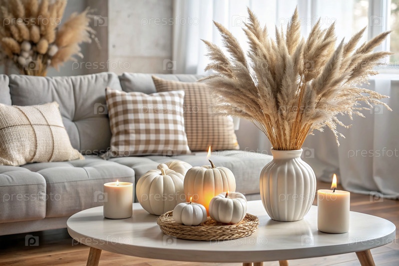 Современная белая керамическая ваза с сухой травой, свечами на деревянном столе и тыквами Скандинавский интерьер Концепция осеннего декора и комфорта в доме