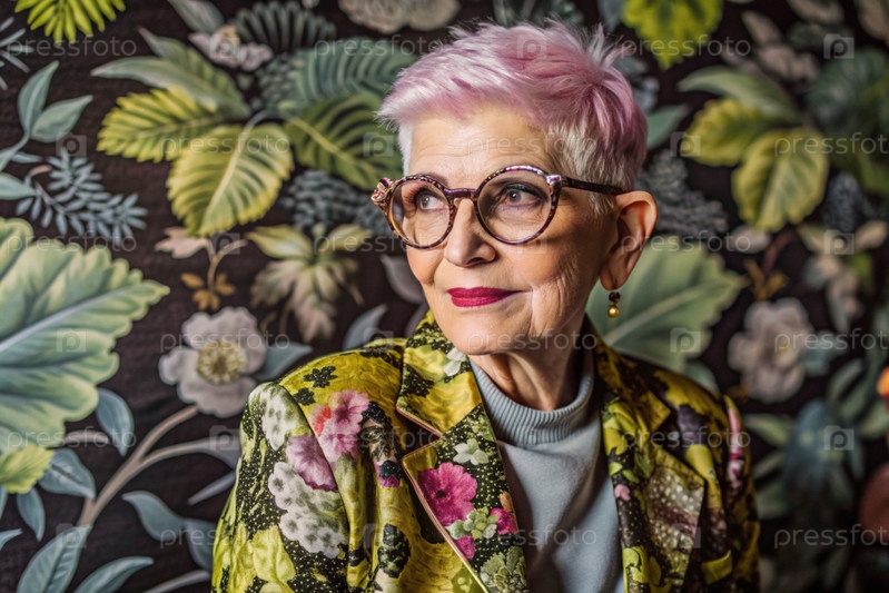 Портрет стильной, модной пожилой женщины, пенсионерки 70 лет, которая носит очки и одежду с цветочными оттисками