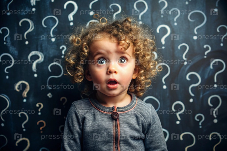 Развитие и образование детей. удивленная девочка на темном фоне с вопросительными знаками. мозговой штурм, детские вопросы и концепция идеи