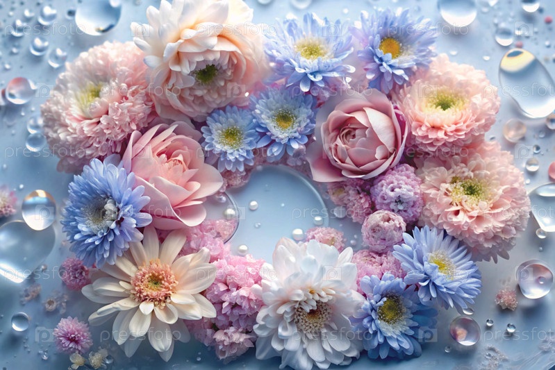 Красивый, воздушный, деликатный цветочный фон в синих и розовых тонах. цветы пиона, хризантемы, ромашки с каплями воды на лепестках