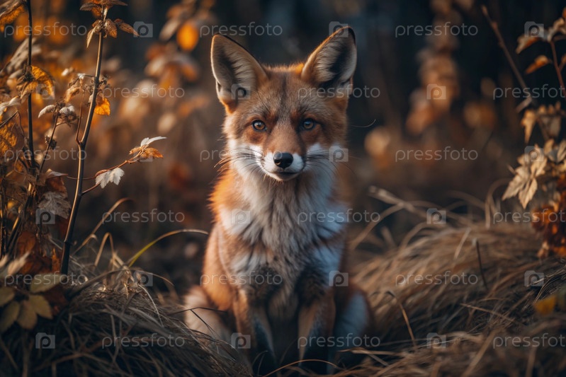 Красная лиса, сидящая среди осеннего листвы.Охота на животных