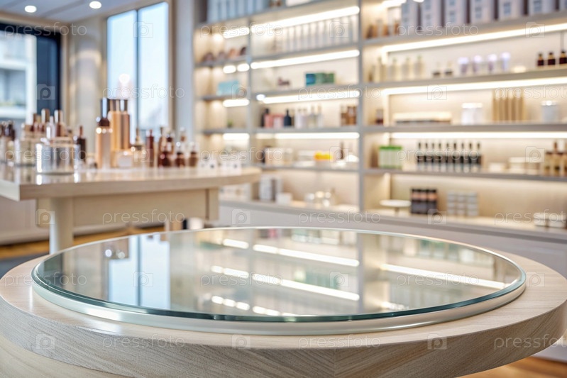 Минимальный фон для демонстрации продукта. Современная стеклянная подиум в современном магазине косметики. Элегантный дизайн для презентации косметической продукции
