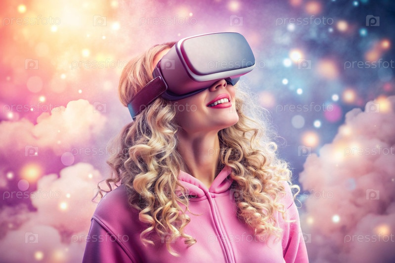 Красивая молодая девушка в розовом капюшоне играет в виртуальную реальность на сказочных розовых облаках с гарнитурой виртуальной реальности перед глазами