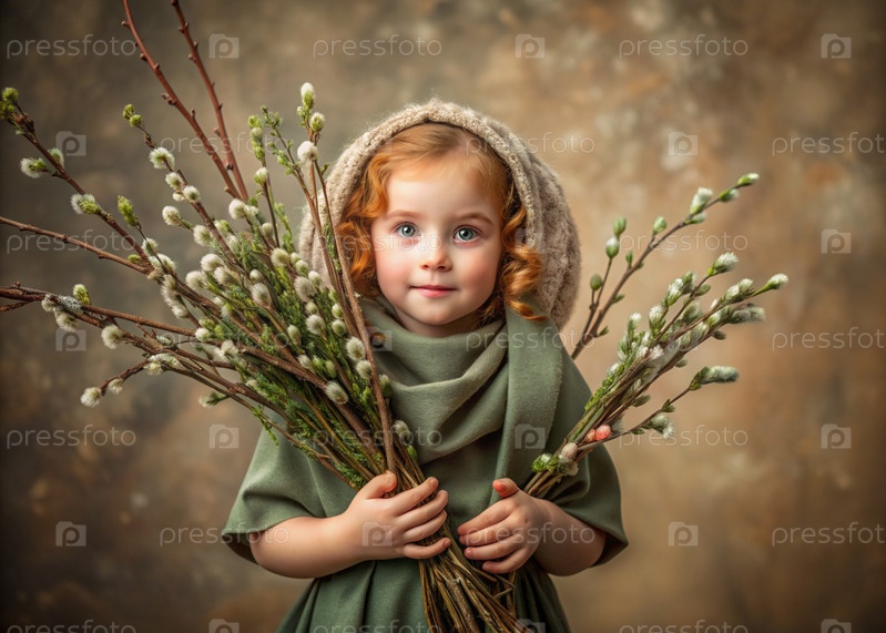 Пальмовое воскресенье. христианство. портрет трехлетней девочки в русском народном шале с ветвями ивы в руках на фоне цветущей ивы