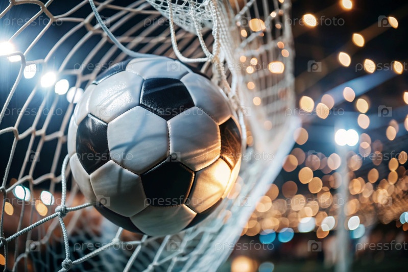 Футбольный мяч в ворота, среди сверкающих огней и размытого фона