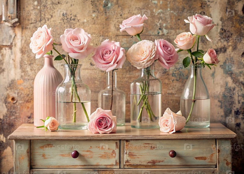 Красивые розы в стеклянных вазах и флаконах на древнем деревянном шкафчике Букет цветов в вазе в интерьере дома Светлый, бежевый, розовый цветочный фон