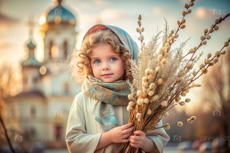 Пальмовое воскресенье. христианство. портрет трехлетней девочки в русском народном шале с ветвями ивы в руках на фоне православной церкви