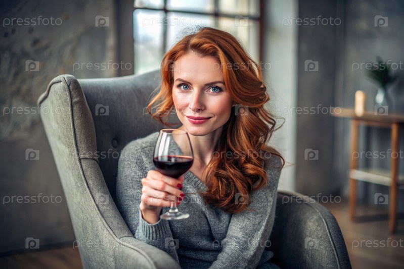 Современная, стильная, красивая женщина с рыжими волосами и бокалом красного вина на стуле в гостиной дома