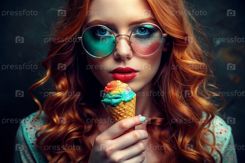 Молодая кудрявая девушка ест мороженое на улице в жаркий летний день