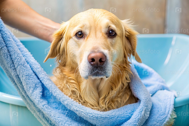 Золотой ретривер купается в пузырьковой ванне. Помыть собаку. Концепция ухода за домашними животными