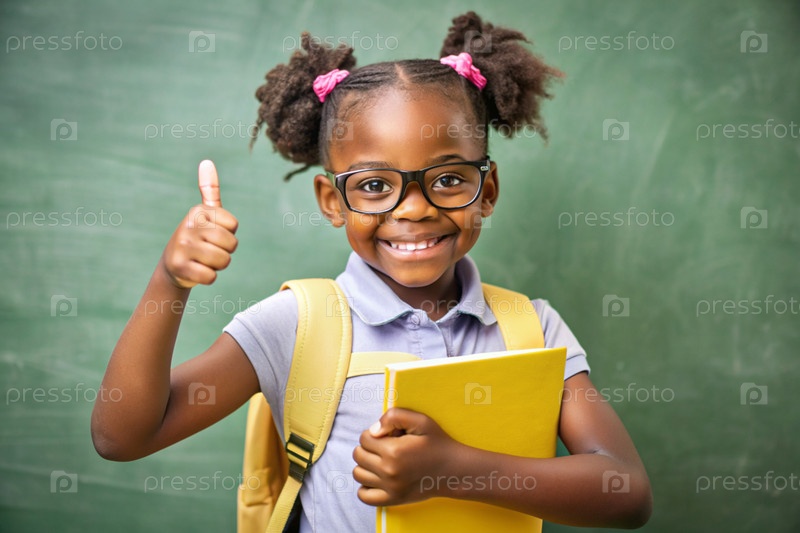 Милая чернокожая афроамериканка с очками показывает класс рукой. Ребенок впервые идет в школу. Ребёнок со школьной сумкой и книгой. Ребёнок в классе с доской. Возвращение к школе