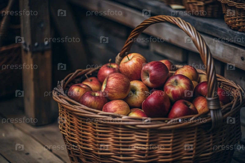 Корзина из косточки, полная свежих фруктов. корзина с красными яблоками. красивое солнечное сияние. осенний урожай, урожай или уборка