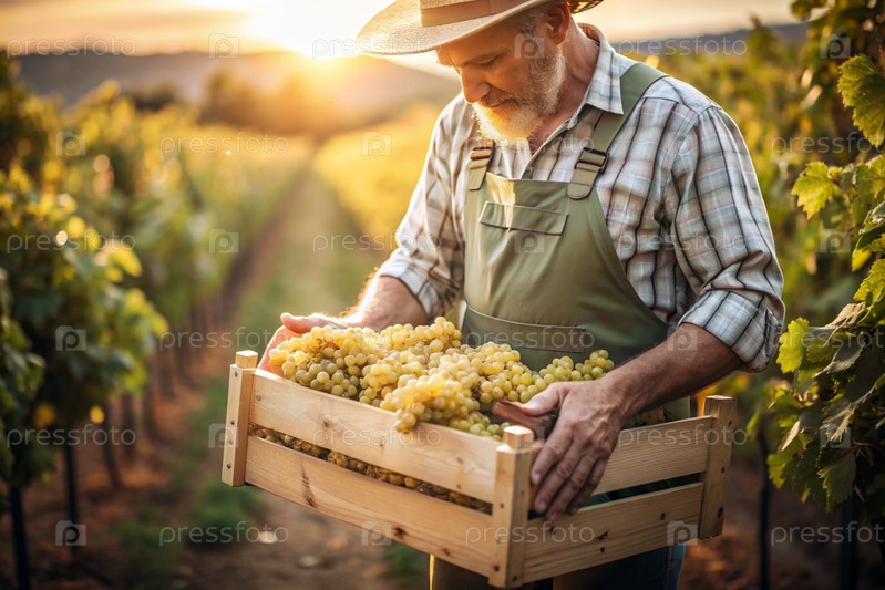 Сельскохозяйственная промышленность. Производство вина. Деревянный ящик с виноградом в руках фермера-мужчины. Садовник собирает богатый урожай. Ближе, солнечный свет. Осенний плодовый сбор