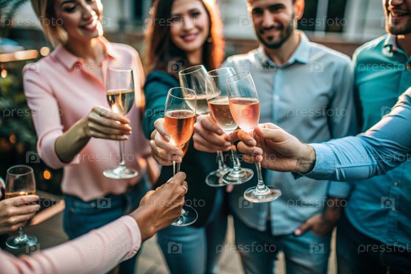 Стаканы розового игристого вина в руках людей. Люди отдыхают на открытой веранде. Понятие праздника, корпоративного мероприятия, вечеринки или праздника