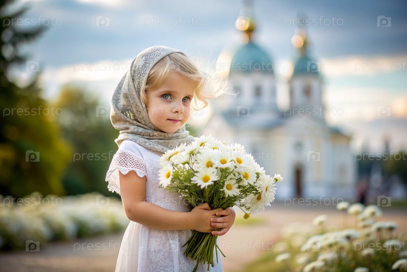 Всероссийский день семьи, любви, верности. красивая маленькая кудрявая девочка в русском шале с букетом ромашки на фоне православной церкви. День святого Валентина Петра и Февронии