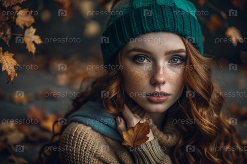 Осенний портрет. Близкий план молодой рыжеволосой женщины с выразительными зелеными глазами в вязанной шляпе и свитере