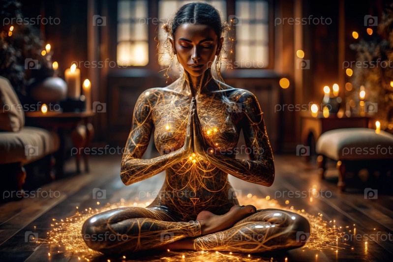 Концепция эзотерической духовной медитации, женщина в позе лотоса.Человеческая медитация, духовность и активация чакр, мистический дух