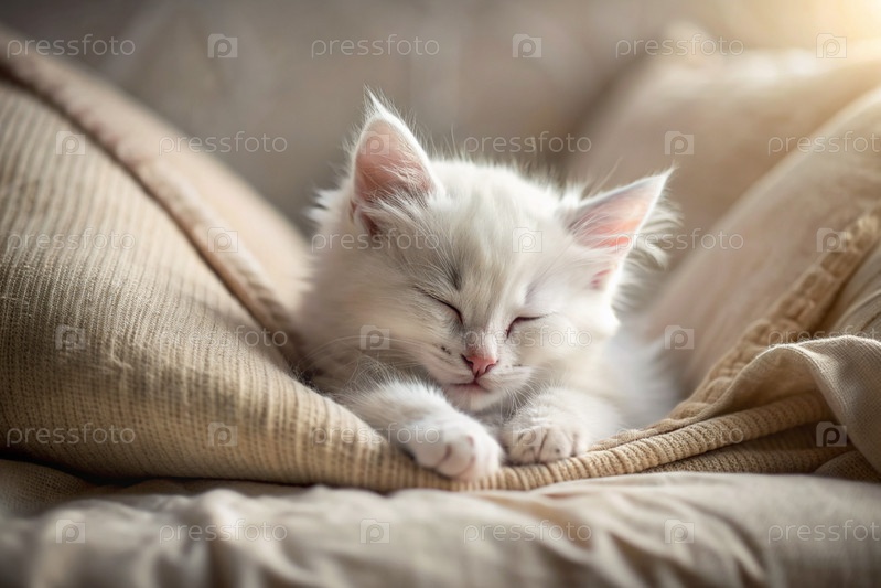 Милый чистый белый пушистый котенок спит на подушке у окна.Кошка удобно расположилась в своем любимом месте, чтобы отдохнуть под солнцем
