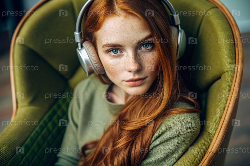Молодая красивая рыжеволосая женщина с веснушками слушает музыку в больших беспроводных наушниках дома на стуле в гостиной