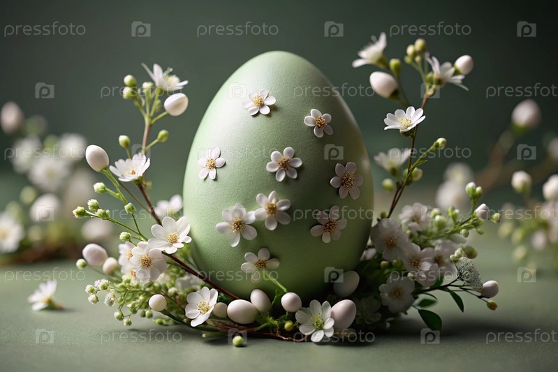 Концепция яркого пасхального праздника минималистична - зеленое пасхальное яйцо с нежными белыми вишневыми цветами на мягком зелёном фоне
