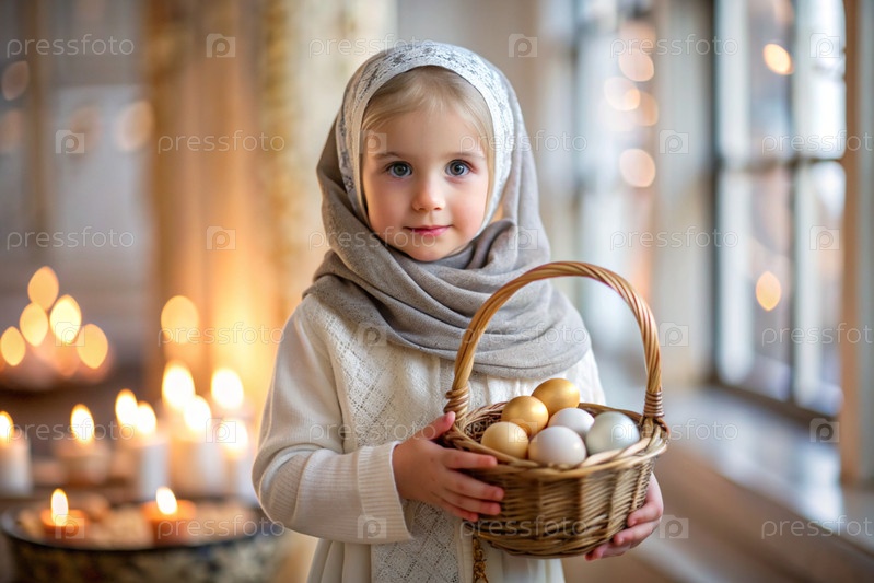 Счастливая Пасха. Христианство. Портрет трехлетней девочки в русском народном платье и шалах с корзиной из плети с пасхальными яйцами в руках на фоне православной церкви