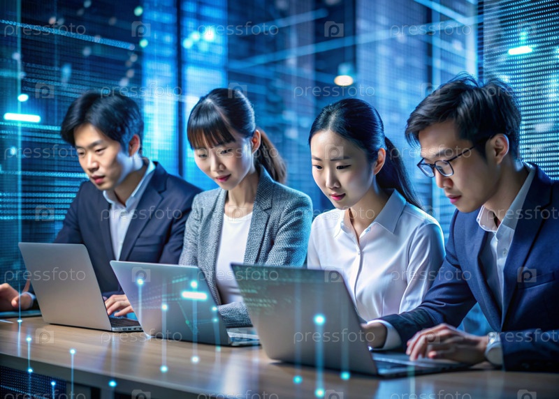 Молодые азиатские мужчины и женщины в костюмах работают в офисе за ноутбуком с цифровыми кодами на виртуальном экране. Цифровые технологии будущего. Разработка программного обеспечения