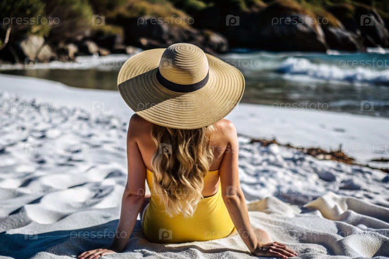 Женщина на отдыхе, сидящая в купальнике и соломенной шляпе с широкими краями на пляже в солнечный день и смотрящая на море