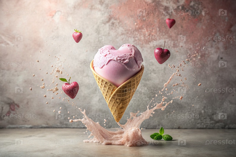 Сладкий десерт. Любовь к мороженому. Сердечно-образный конус мороженого с брызгами, сердцами и пятнами. Концепция Дня святого Валентина. Баннер, реклама