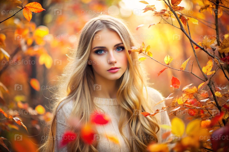 Осенний портрет. Близкий план молодой блондинки с выразительными глазами в вязанном свитере. Красивая девушка в осенних листьях