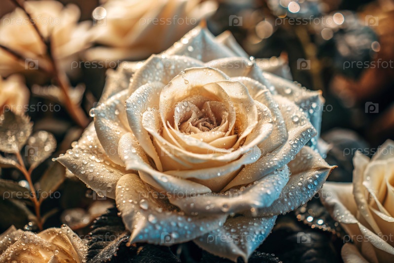 Кремовая роза красивого цвета кофе или шампанского, покрытая росой на рассвете. Красивое солнечное сияние. Фон изображения выполнен в зеленых и бежевых тонах. Естественный, экологически чистый естественный фон