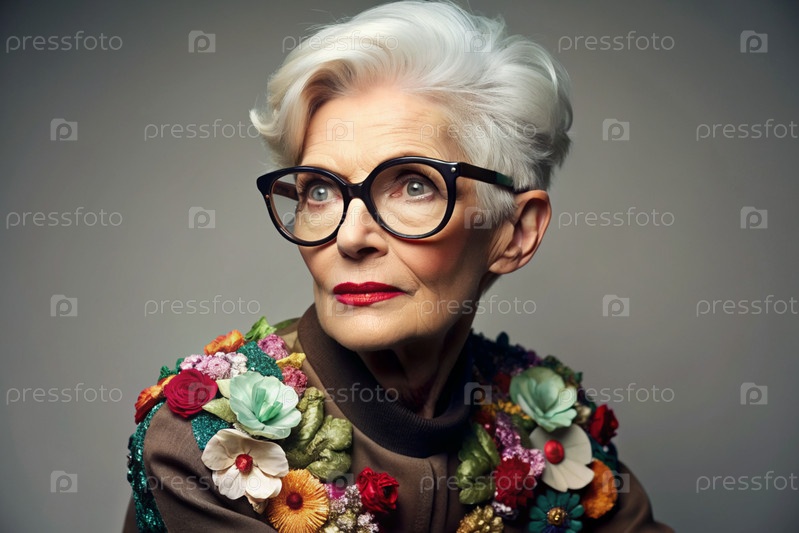 Портрет стильной, модной пожилой женщины, пенсионерки 70 лет, которая носит очки и одежду с цветочными оттисками