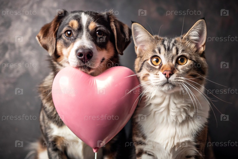 День святого Валентина. маленький котенок и щенка с розовым сердцем. концепция любящих домашних животных