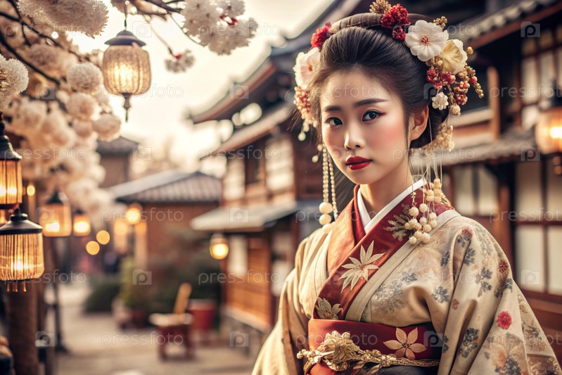 Японская девушка в традиционном национальном костюме - кимоно. На фоне домов, фонарей и вишневых деревьев портрет символизирует традиции и культуру народа Японии