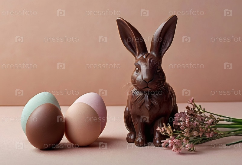 Пасхальные сладости и лакомства. Концепция ярких пасхальных праздников в 2026 году. Хорошая открытка. Баннер. Шоколадные пасхальные яйца, шоколадный кролик и весенние цветы на деревянном фоне