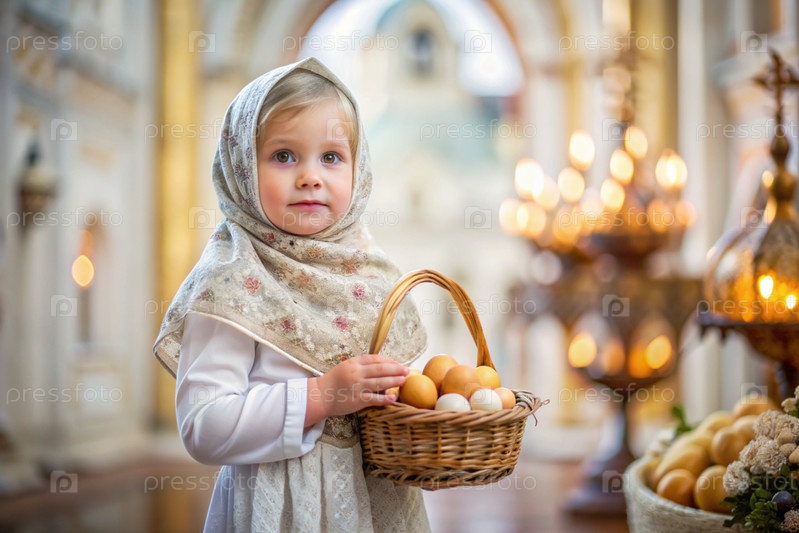 Счастливая Пасха. Христианство. Портрет трехлетней девочки в русском народном платье и шалах с корзиной из плети с пасхальными яйцами в руках на фоне православной церкви
