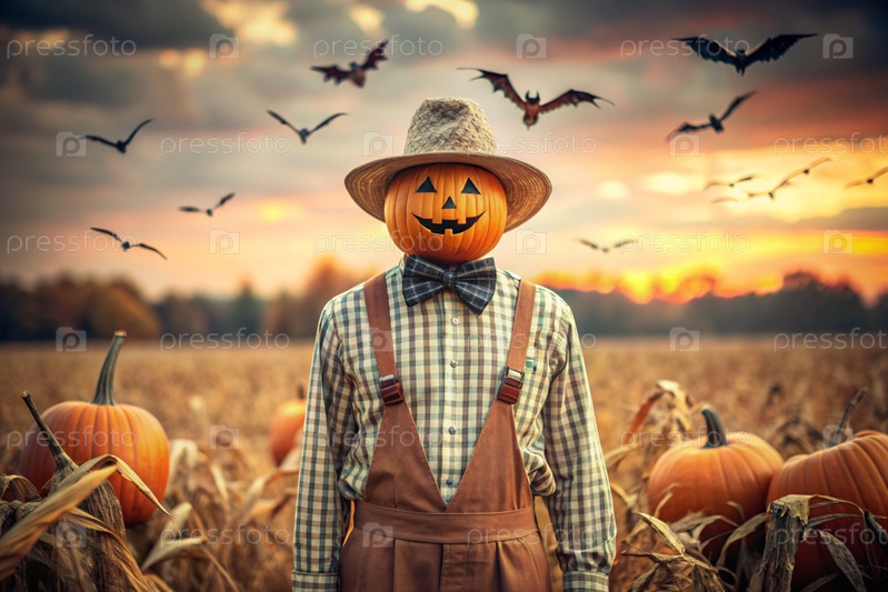 Концепция Хэллоуина. Ужасная. Страх. Устрашающий богий с тыквенной головой, квадратной рубашкой и бабочкой. Баннер, открытка