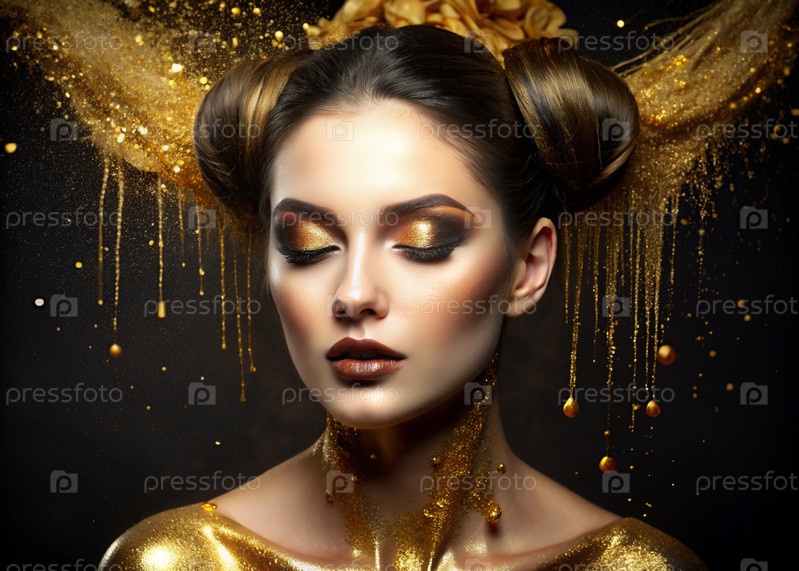 Творческий баннер для салона красоты в черно-золотых тонах. Профессиональный макияжный художник, стилист и парикмахер. Красивая женщина с вечерним гримом и золотыми рогами на голове. Индустрия красоты