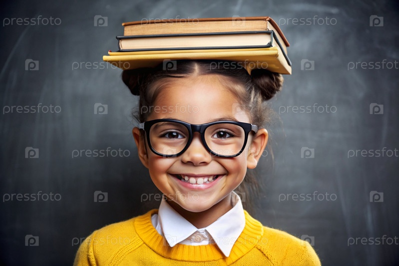 Красивая девушка с очками и книгами на голове. Ребенок впервые идет в школу. Ребёнок в классе со доской на заднем плане. Возвращение к школе