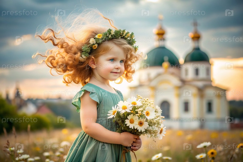 Всероссийский День семьи, любви и верности Красивая маленькая кудрявая девочка с букетом ромашек на фоне Православной церкви День святого Валентина Петра и Февронии