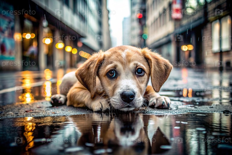блуждающее животное. мокрая, грустная, брошенная, голодная щенка лежит в луже под дождем. убежище, спасение, благотворительность, пожертвования бездомным животным