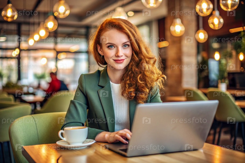 Молодая бизнес-женщина работает на ноутбуке в кафе или делает покупки онлайн