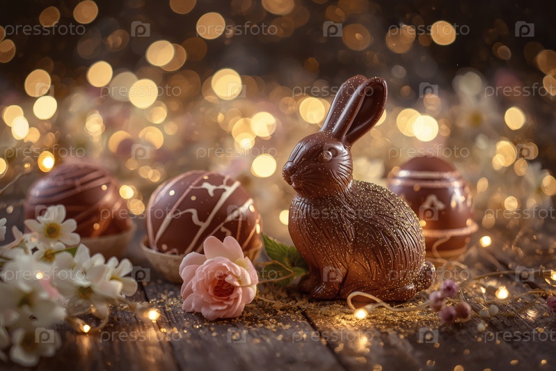 Шоколадное пасхальное яйцо, шоколадный кролик и весенние цветы на деревянном фоне. Пасхальные сладости и лакомства. Концепция яркого праздника Пасхи в 2026 году. Хорошая открытка